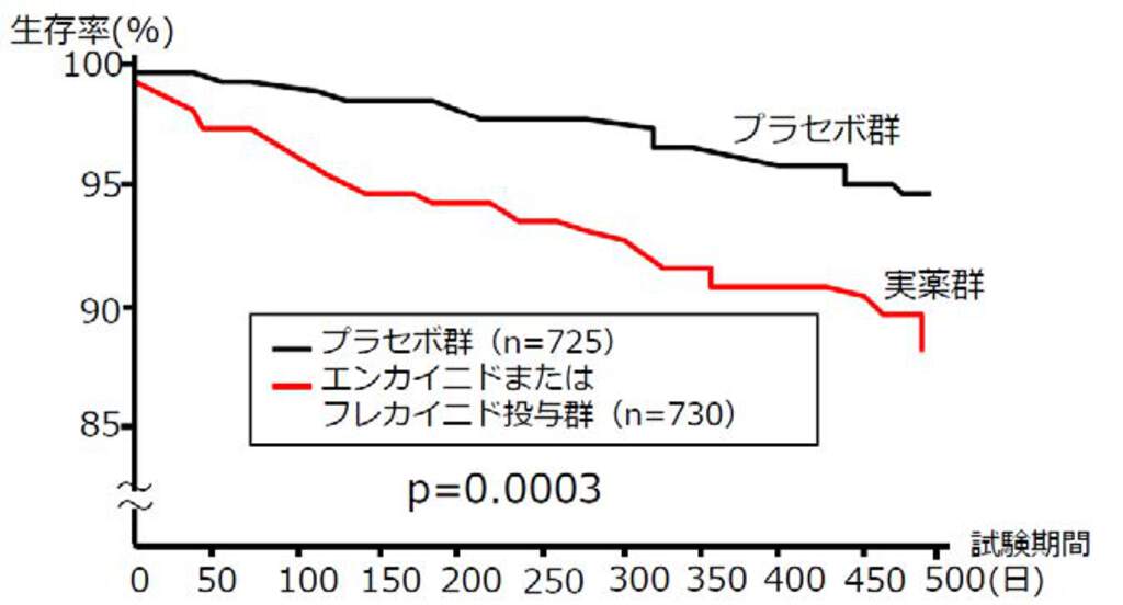 CAST試験において、プラセボ投与群に比べて実薬投与群(当時最も強力で新しい抗不整脈薬であったフレカイニドやエンカイニドなどのIc群抗不整脈薬を投与された群)では生存率が減少、言い換えると、実薬を投与することにより2.5倍ぐらい死亡率を高めたという結果が得られました(下図)。