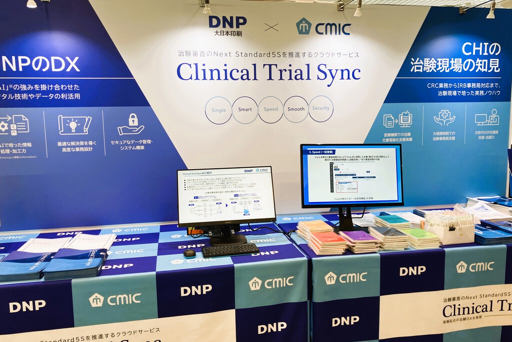 本展示では、両社が共同開発を進めている治験文書クラウドサービス「Clinical Trial Sync(クリニカルトライアルシンク)」をご紹介しました。ブースでは実際の画面イメージや活用シーンを交えながら、医療機関・治験依頼者・IRBそれぞれの立場における導入メリットや、治験文書管理DXの具体的な運用イメージをご説明しました。