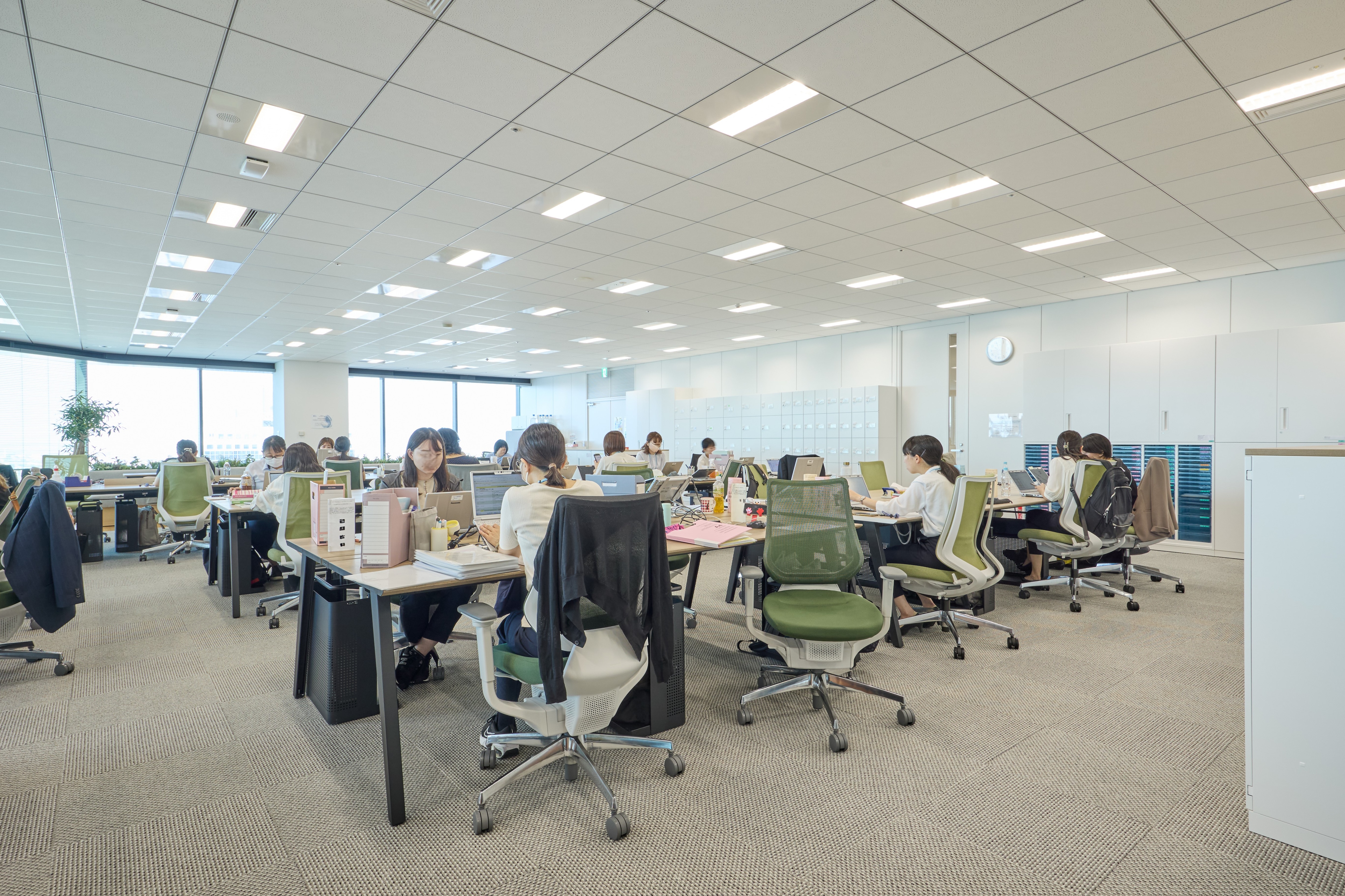大阪オフィスはフリーアドレス制を導入し、社員一人ひとりの働き方に寄り添った環境を整えています。窓際の明るい席をはじめ、打ち合わせに適したファミレス席、オンライン会議に集中できる防音ブースなど、用途に応じたワークスペースを完備。快適かつ効率的に業務に取り組めるよう、個々のワークスタイルを尊重しながら、社員の生産性と働きやすさの両立を大切にしています。
